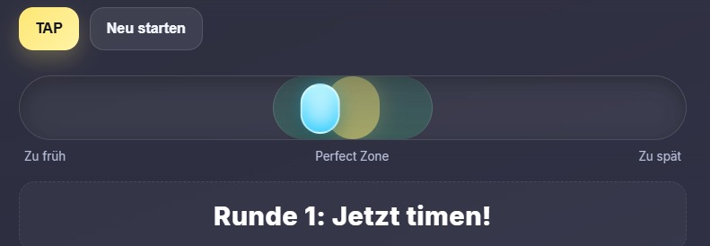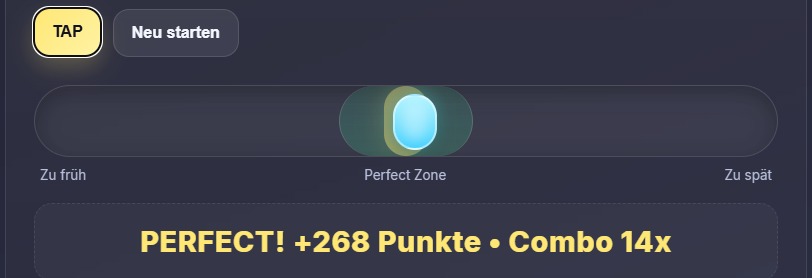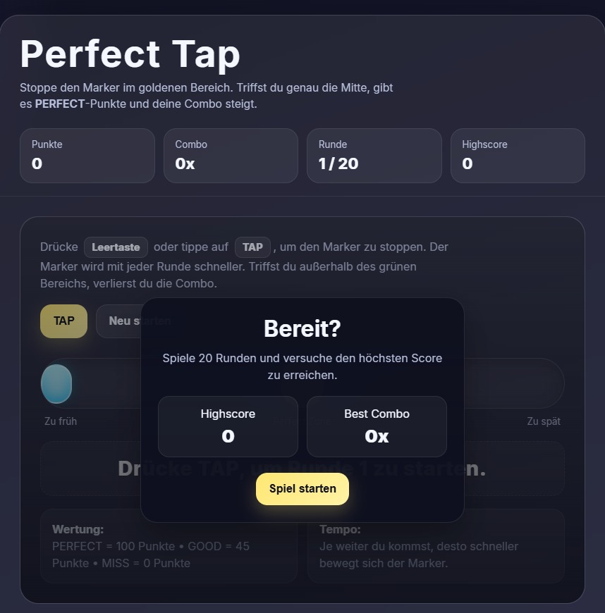 Perfect Tap is a simple but addictive timing game. Your goal is to stop the moving bar at the perfect moment. - PERFECT hits give you the most points - Build combos to increase your score - The speed increases every round Can you reach the highest score? Controls: - Press SPACE or TAP button